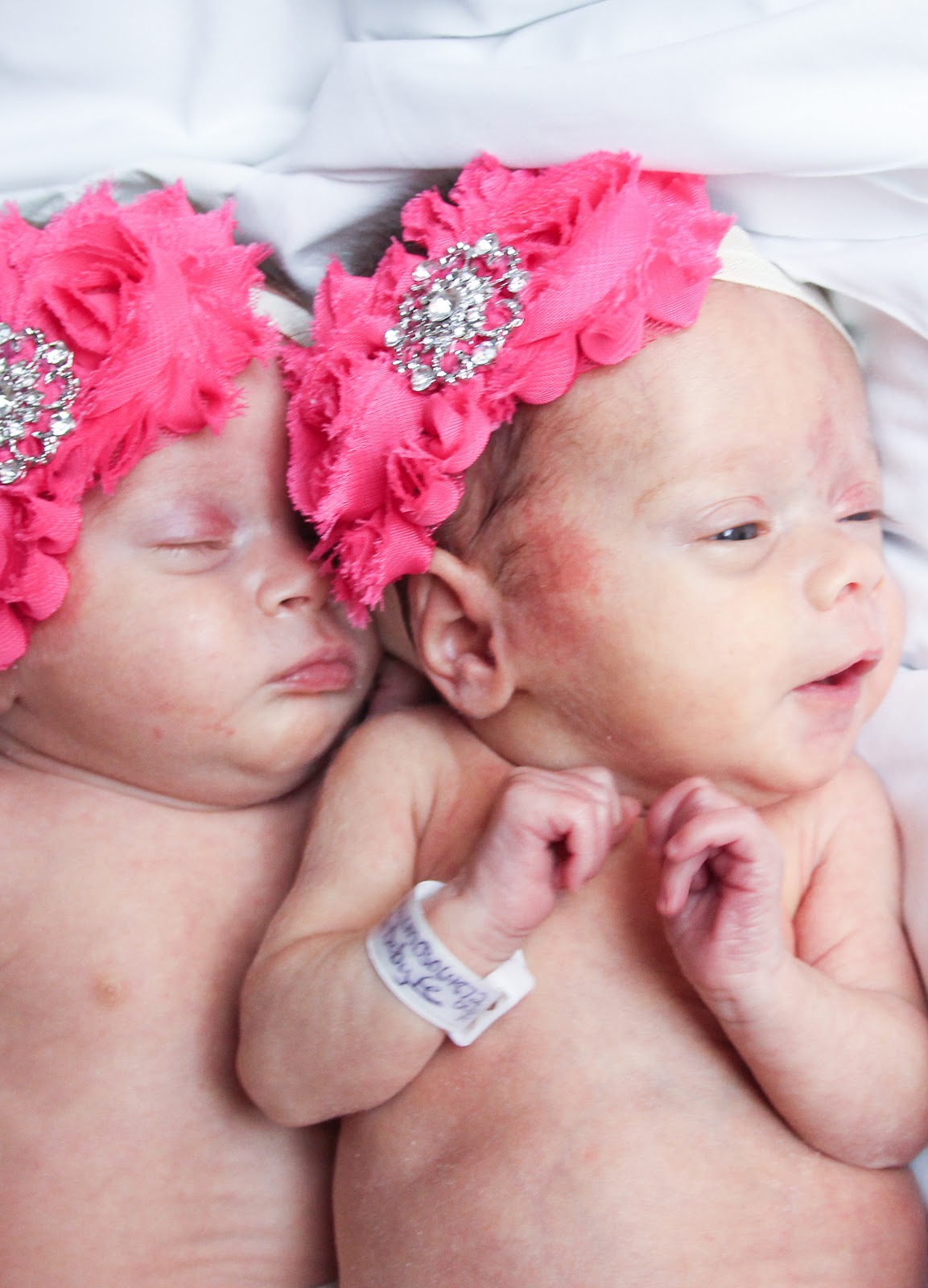 The girls posed for their first of two professional photo shoots. These are a couple weeks old and back in the NICU. The next shoot took place a couple weeks later at home and we are still awaiting the pics from the photographer, hopefully soon.